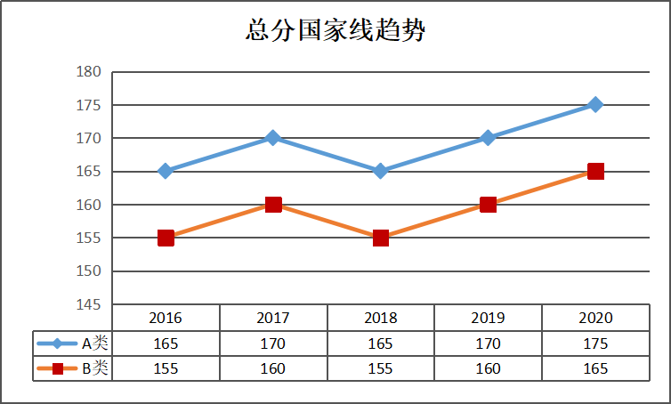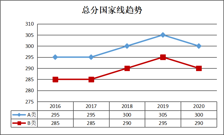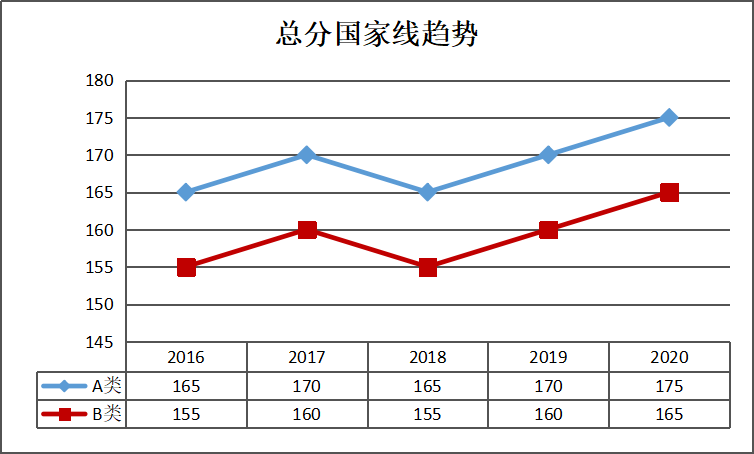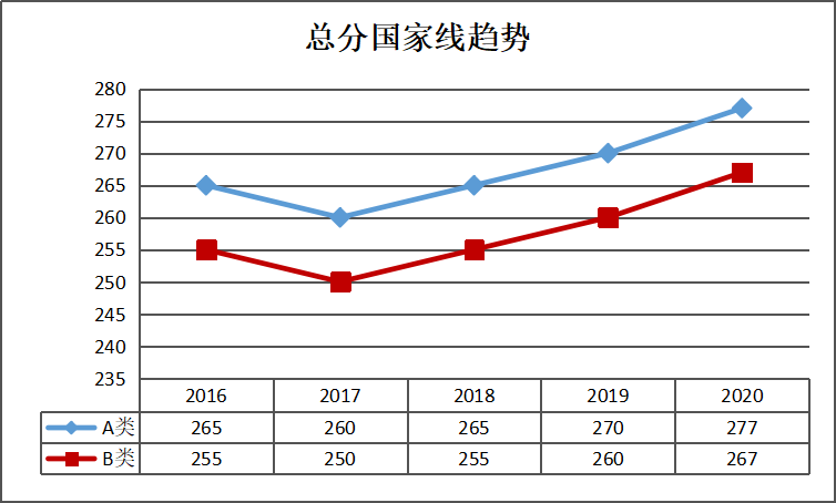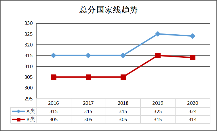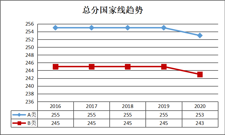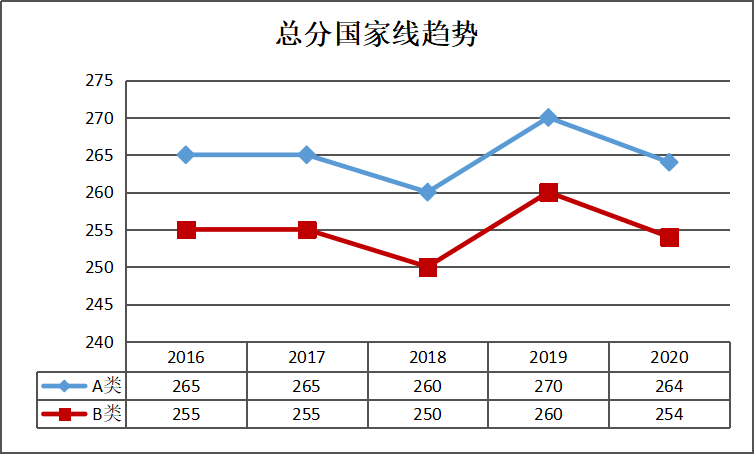 小科(满分=100) A类 B类 2020年 46 43 2019年 44 41 2018年 44 41 2017年 44 41 2016年 45 42 大科国家线一览表